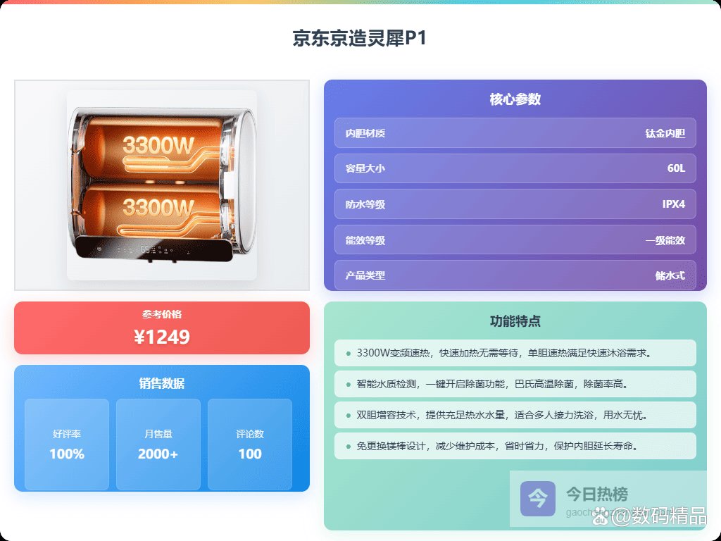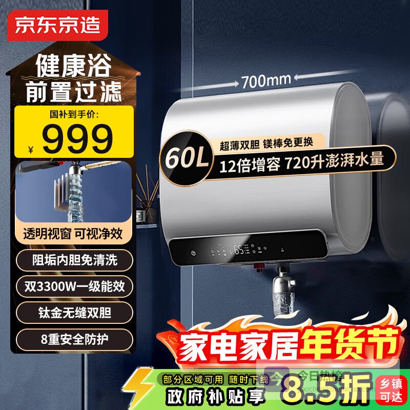 京东京造超薄双胆60L电热水器灵犀P1国家补贴3300W变频速热阻垢无垢免更换镁棒一级能效防电墙JZ-KB60P01¥