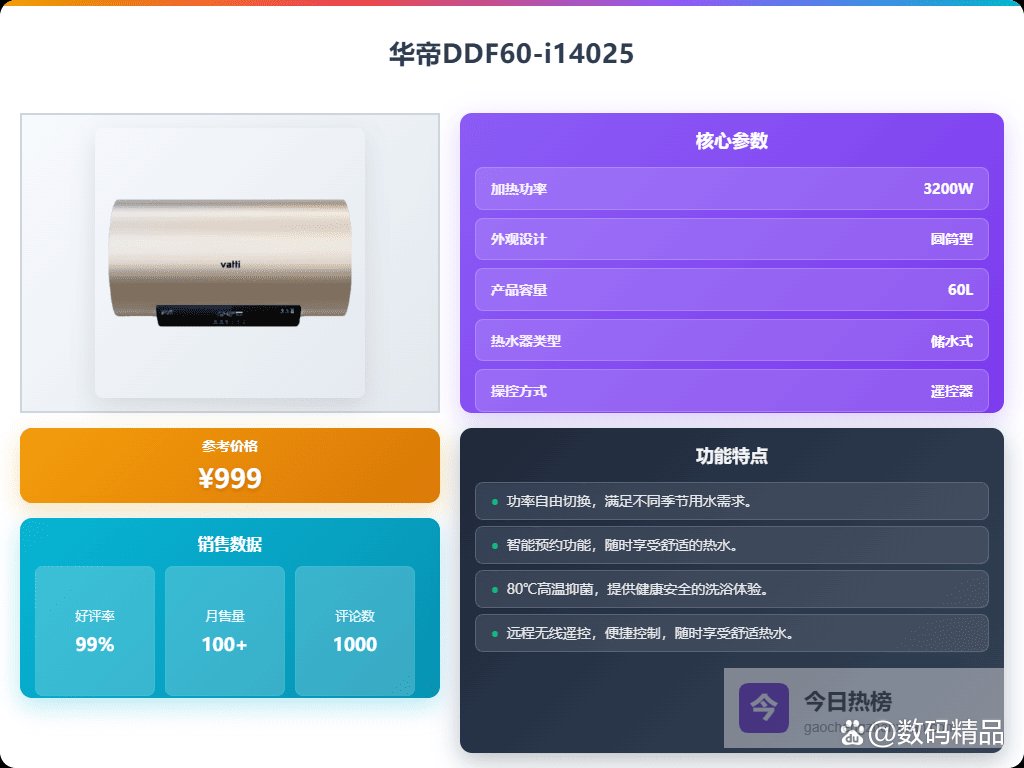 六、华帝① 快速加热:这款华帝DDF60-i14025配备3200W的变频速热技术,加热速度挺快的,不用等太久就能用上热水。变频调节还能根据用水量智能调整,真正满足家庭多样化的用水需求。
