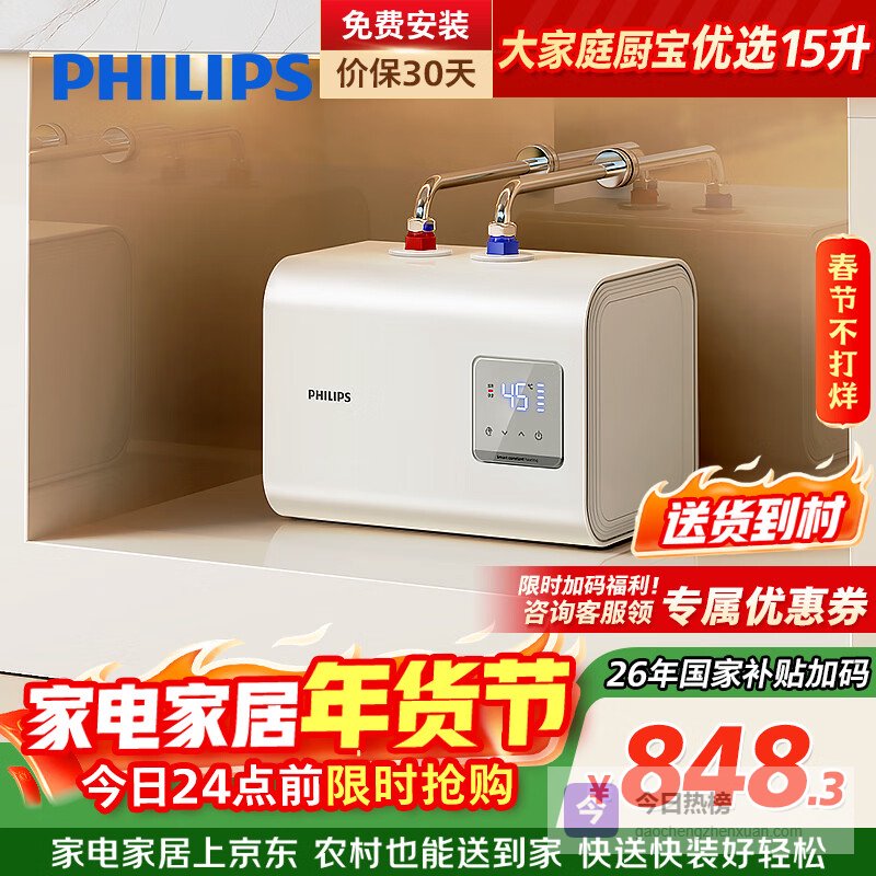 飞利浦(PHILIPS)15升小厨宝热水器一级能效 3000W速热洗菜洗碗厨房热水宝 AI自适应 国家补贴15% 哈登AWH1075/93¥