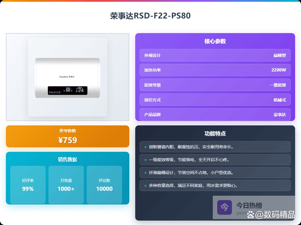 四、荣事达① 空间小巧:这款荣事达80升电热水器采用扁桶设计,厚度只有27.5厘米,比传统圆桶节省不少空间,放在厨房、卫生间都还挺合适。占地面积小,不会影响家里其他家具摆放,特别适合小户型使用。