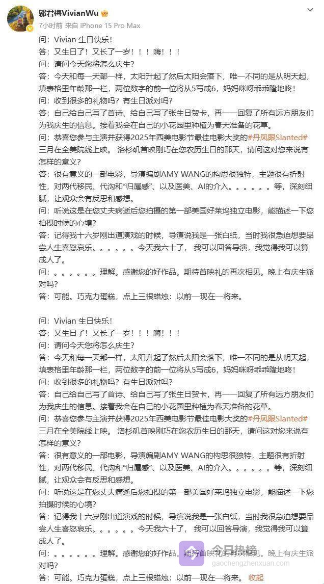她不再是被观看的“东方花瓶”,而是有主体性的生命叙述者。主动选择在生日当天公布丈夫病逝的消息,而不是被狗仔队偷拍;强调为自己写诗、种花的庆生方式,而不是办奢华派对;用“他走了”三个字掌控叙事节奏,而不是在长篇专访里剖白隐私。