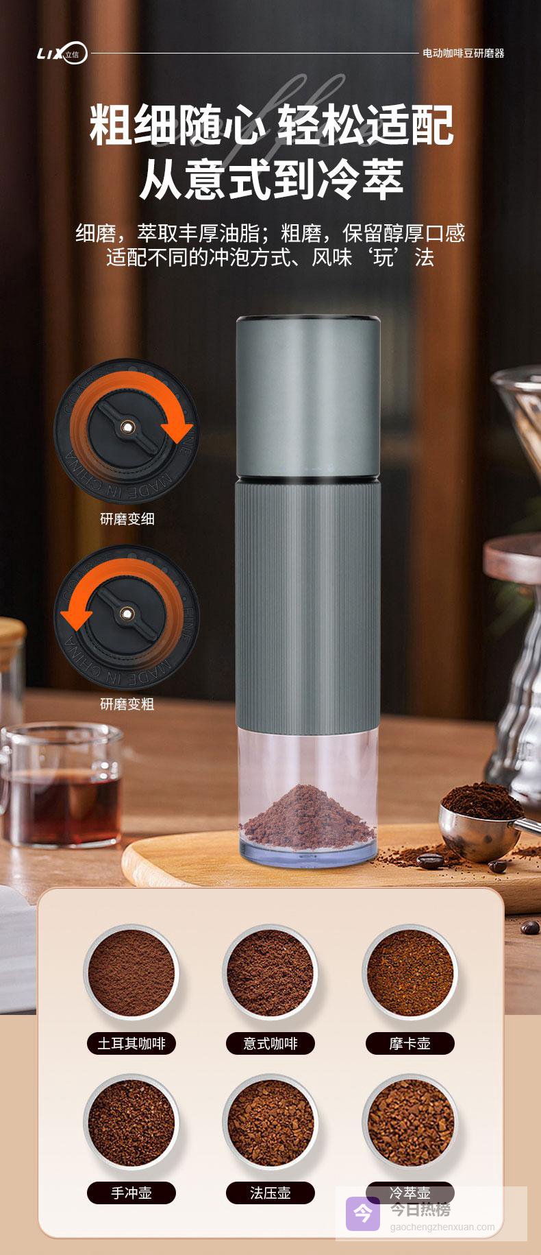 研磨,是咖啡风味的起点。而你的起点,从这里开始。立信 电动咖啡豆研磨机 —— 新鲜,如此轻松。