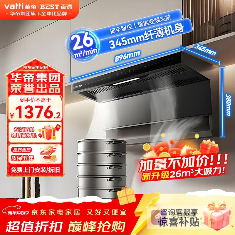【品牌直营】百得华帝出品顶侧双吸抽油烟机家用变频烟机灶具套装26立方大吸力挥手智控吸油烟机热水器消毒¥
