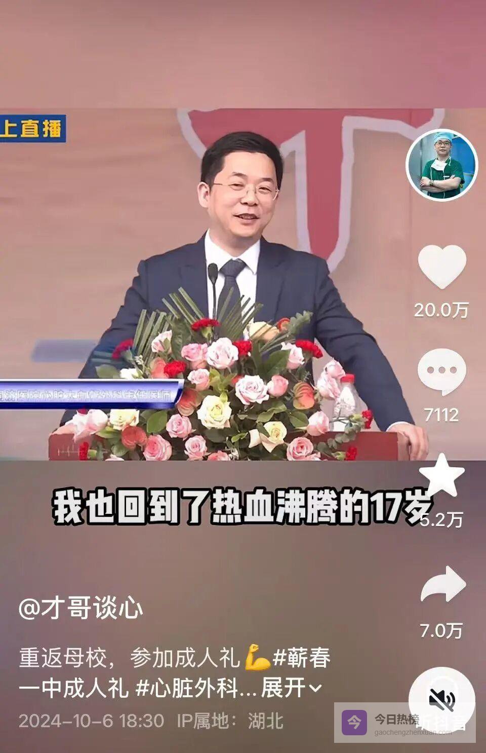 @才哥谈心 的抖音主页,首条置顶分享的是程才回母校参加高中成人礼的视频。