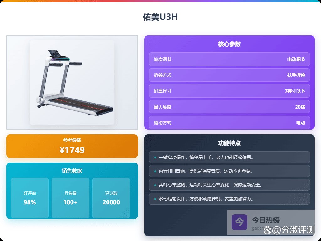 4、佑美U3H这款佑美U3HD跑步机配备了电动坡度调节功能,最高支持20档调节,让锻炼更具多样性。跑带宽达62厘米,宽敞舒适,即使速度快一些也不会踩空。内置多维度减震系统,配合国家专利减震技术,能有效缓冲冲击,减轻关节压力。全触控面板操作简便,信息显示直观,避免繁琐的学习曲线。
