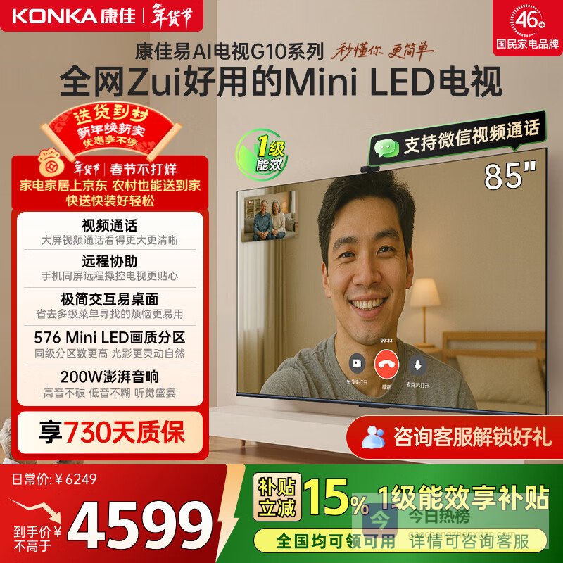 【京东自营】康佳电视85G1085英寸【安装版】MiniLED576分区智能平板电视机一级能效【固定¥