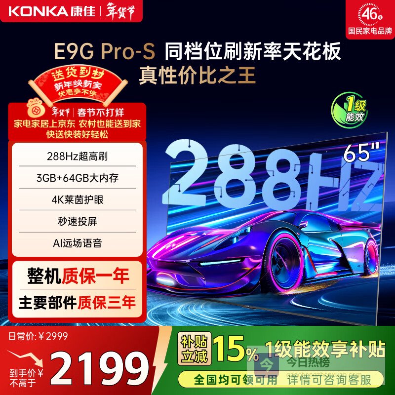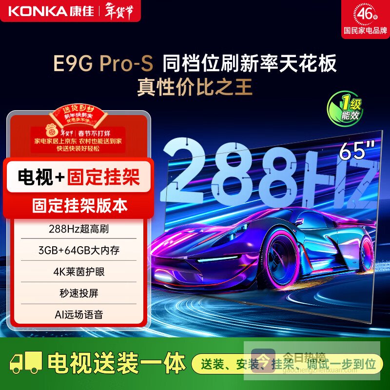 【京东自营】康佳电视65E9GPRO-S65英寸【安装版】288Hz高刷MEMC护眼3+64G【固定¥