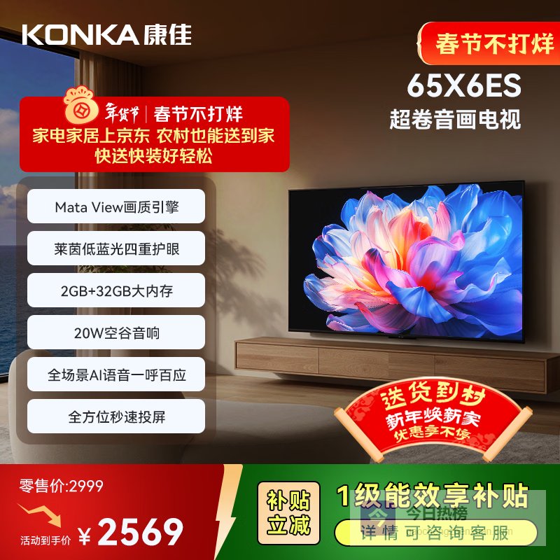 【京东自营】康佳电视65X6ES65英寸2+32GB4K超清全面屏一级能效智能液晶平板游戏电视机会议¥