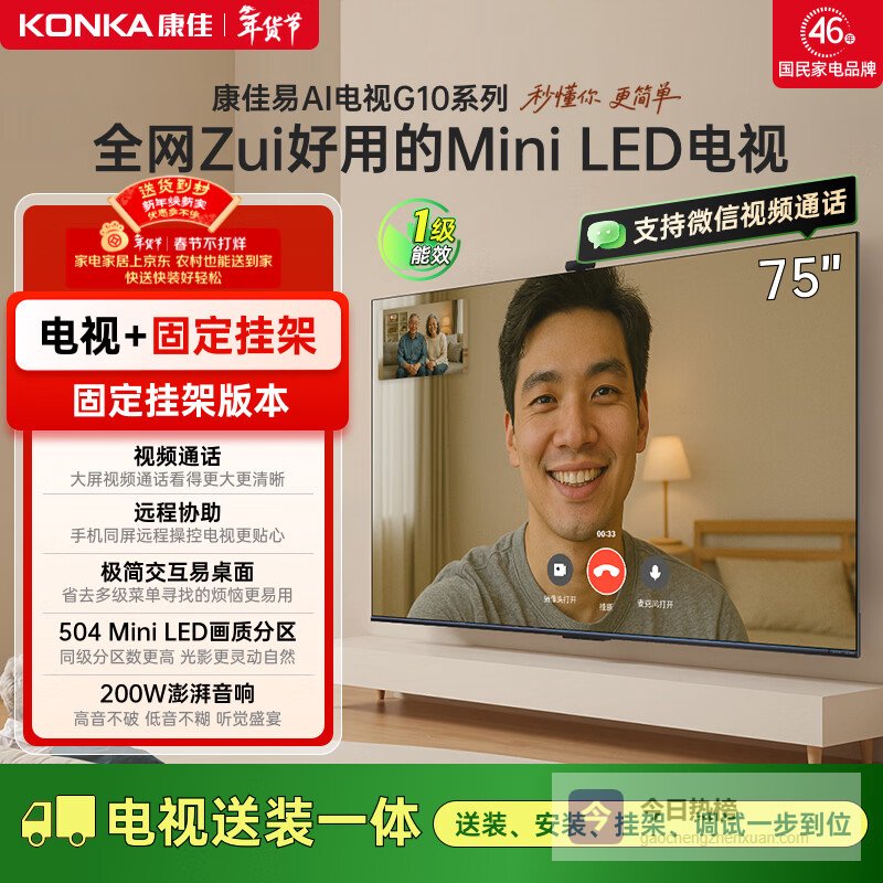 【京东自营】康佳电视75G1075英寸【安装版】MiniLED504分区智能平板电视机一级能效【固定¥