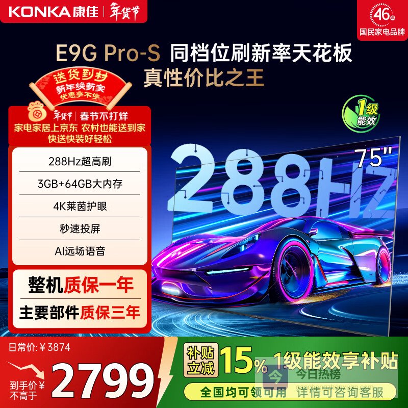 【京东自营】康佳电视75E9GPRO-S75英寸【安装版】288Hz高刷MEMC护眼3+64G【固定¥