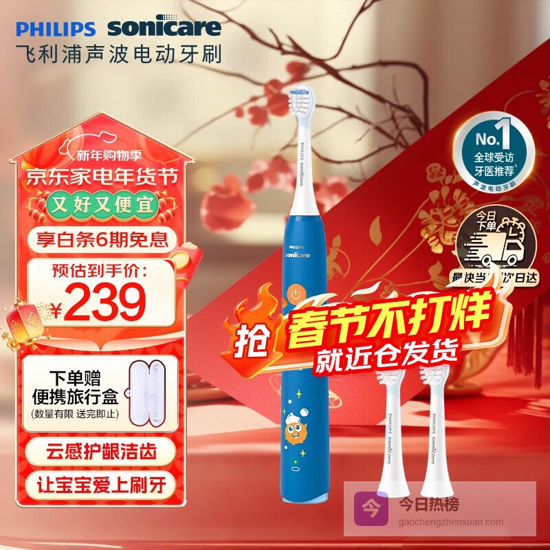 飞利浦(PHILIPS)儿童电动牙刷适用4-6-12岁声波震动牙刷便携宝宝送男孩/女孩/生日礼物国家补贴新年情人节礼物 男宝款HX2432/01¥