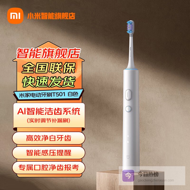 5、米家T501这款电动牙刷配备声波震动技术,每分钟高达64000次的振动频率,能够有效去除牙菌斑,带来深层次的洁净感。它还搭载AI智能净齿系统,可以实时监控牙齿表面,识别漏刷区域和错误动作,确保每次刷牙都更全面。智能感压提醒功能也很贴心,过度用力时会自动减弱震动,保护牙龈免受损伤。
