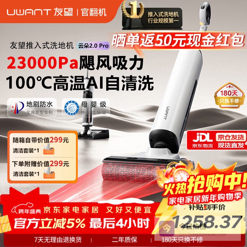 UWANT友望洗地机云朵2.0 pro官翻机吸拖洗一体自动清洗家用吸尘器推入式大吸力12cm躺平拖地洗地一体机 云朵2.0 pro官方正品【官翻机】 100℃自清洁 烘干【送耗材礼包 晒单领50现金】¥