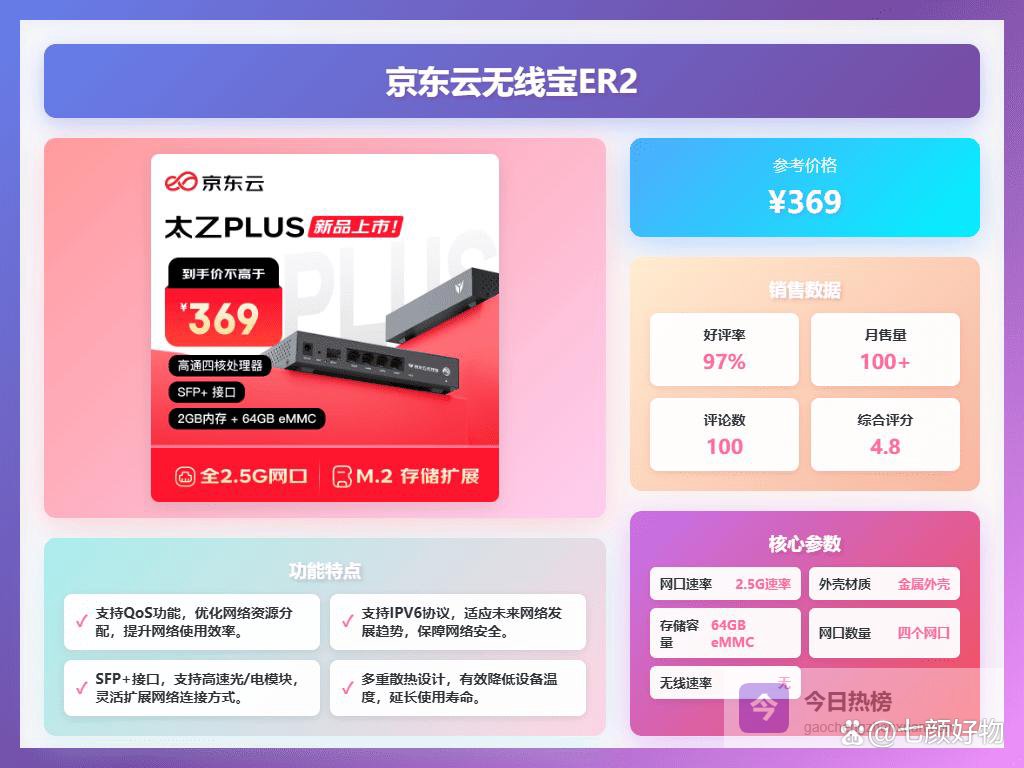 四、京东云无线宝这款京东云无线宝ER2,没有华丽无线,却配备了多达4个2.5G网口,让你轻松应对多个高速设备同时在线。无论是直连游戏主机,还是NAS家庭存储,都能享受到超高速稳定的网络传输,不用担心卡顿掉线。