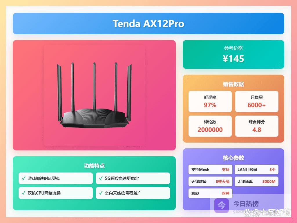 三、Tenda这台Tenda AX12 Pro配备了全向五天线,信号覆盖范围不再有限,家里每个角落都能收到强信号。穿墙穿得比我还努力,130到150平方米的空间都能畅快上网,哪怕你在厨房边刷剧,也能顺畅无压力。试了下,信号稳定得挺令人放心,不会突然变“哑巴”。