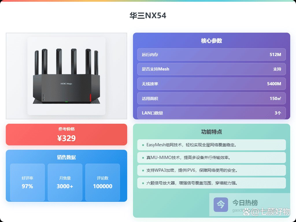 七、华三这款华三NX54支持Wi-Fi 6,一开机就能感受到飞快的速度,最高达5400M,让你玩游戏、看视频都顺畅到飞起,根本不用担心卡顿。双频设计带来更灵活的连接选择,家里多个设备同时上网也能保持稳定,特别适合高强度使用场景。