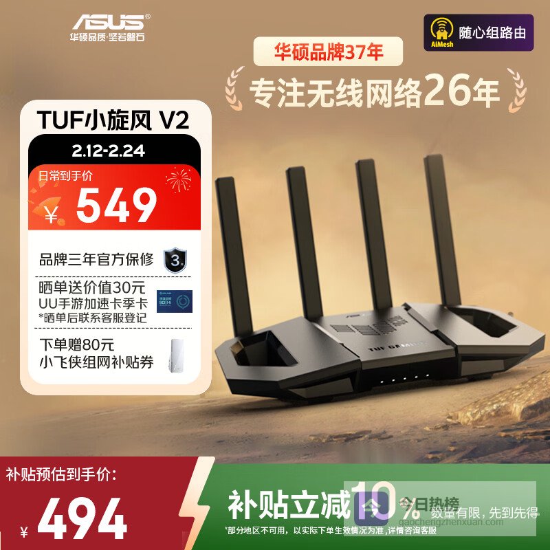 华硕(ASUS)【焕新补贴】TUF小旋风V2 WiFi7电竞路由器 家用无线千兆穿墙王路由 全屋WiFi7套装Aimesh随心组¥