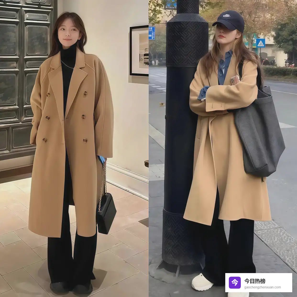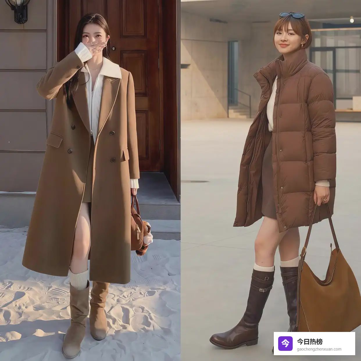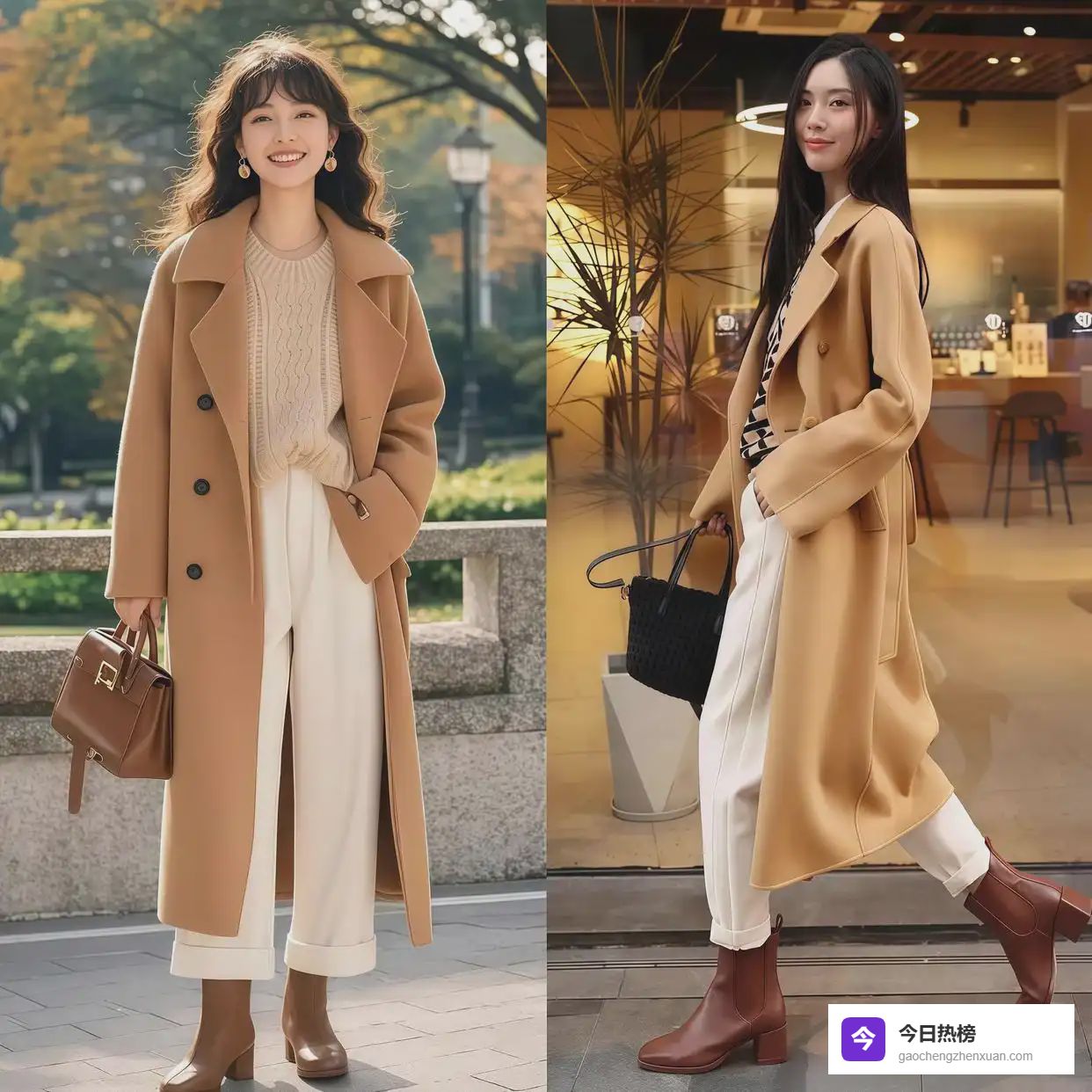 示范一:深棕色+浅棕色大衣搭配,温柔优雅