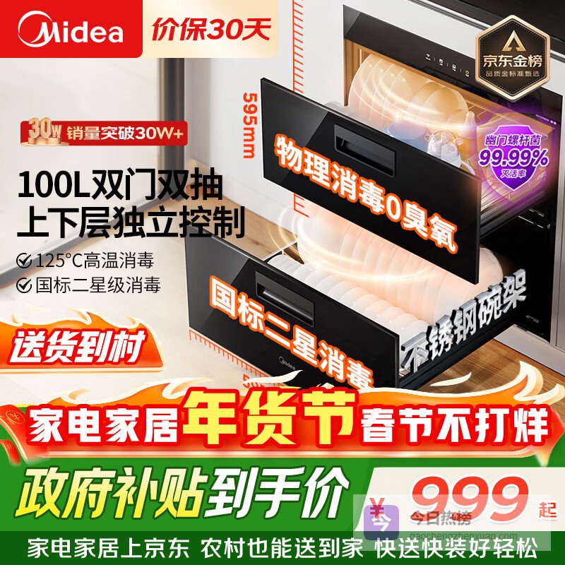 美的(Midea)暖阳消毒柜嵌入式家用 100L双层大容量餐具碗柜碗筷高温消毒碗柜【政府补贴】 MX¥