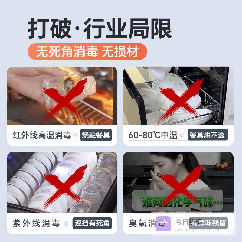 误区2:“臭氧消毒有害,一定要选无臭氧的”真相:臭氧消毒确实有异味,但合格消毒柜的臭氧浓度会控制在安全范围内(≤0.1mg/m3),且消毒完成后会自动分解(通常30分钟内),只要选择“臭氧+紫外线”组合,并确保有“臭氧分解”功能,就不会有健康风险。避坑建议:别因噎废食,臭氧是杀灭不耐高温餐具细菌的重要手段,选带“臭氧自动分解”功能的型号即可。