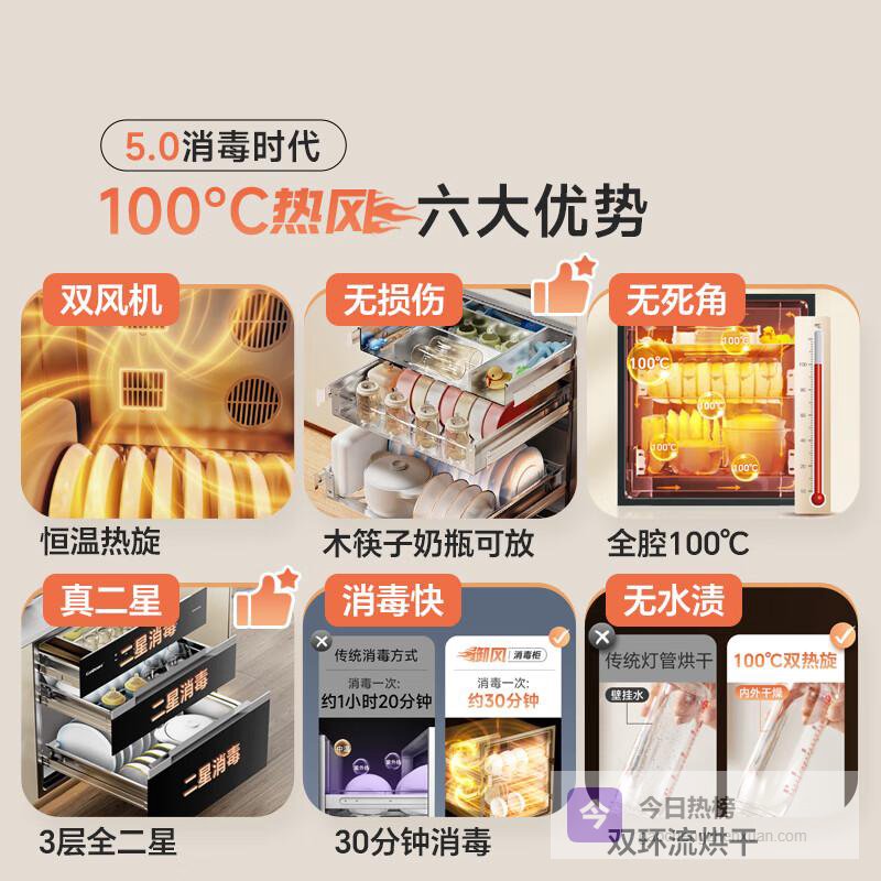 1. 入门级:基础消毒+定频烘干,适合小家庭过渡核心特点:容量60-80L,消毒方式以“高温+紫外线”为主,烘干多为定频或自然风,价格在1000-2000元;优点:价格低,满足基础消毒需求,适合餐具少、预算有限的1-2人家庭;缺点:烘干效果一般(潮湿天气可能不彻底),功能单一(无智能控制、童锁等);适合人群:租房党、小家庭过渡期使用,对消毒要求不高。