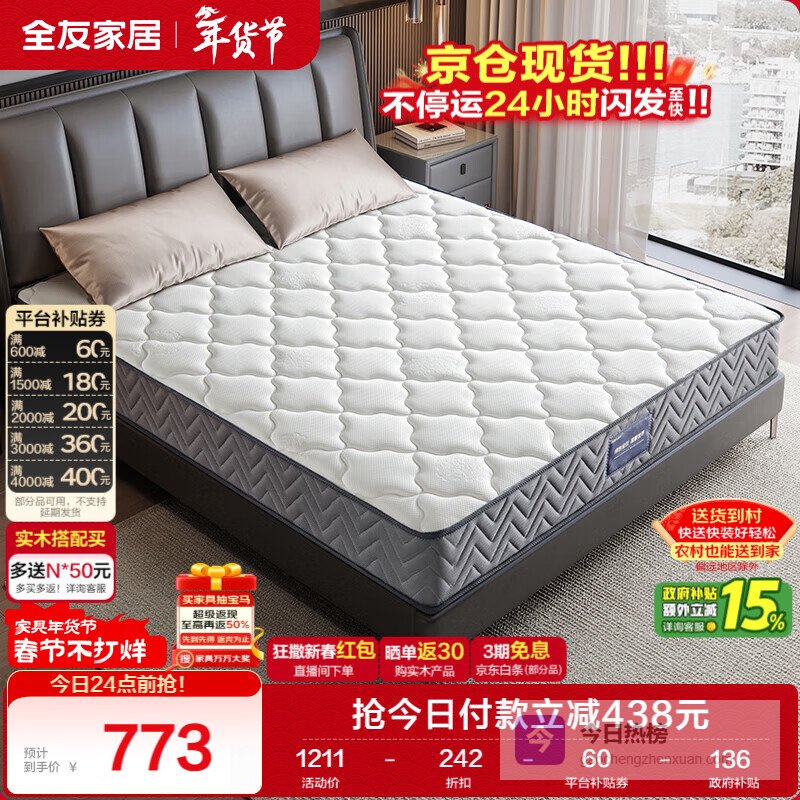 【京东自营】全友家居环保椰棕弹簧床垫1.5米x2米老人小孩透气护脊席梦思床垫子硬¥