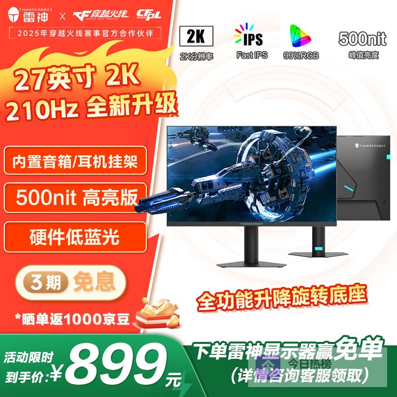 雷神(ThundeRobot)27英寸2K 210Hz原生200 Fast IPS硬件低蓝光 升降旋转HDR450nit峰值非180电脑显示器ZQ27F210L 500nit高亮版JQ27F210L-Pro¥