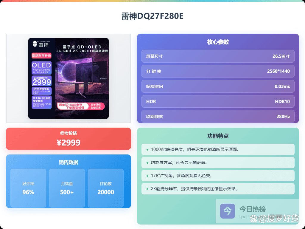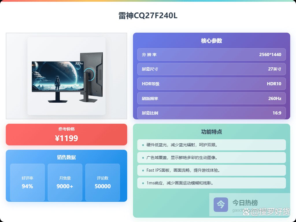 当然啦,好用是好用,具体哪一款适合你,还真是个问题。毕竟每个人的需求不一样,喜欢的风格也不一样。 2K显示器在清晰度、色彩和刷新率之间找到了一个平衡点,价格也相对亲民。如果你正考虑入手一台2K显示器,并且对雷神这个品牌有点兴趣,那我觉得你来对地方了!下面给大家挑了6款,感兴趣的可以了解下。