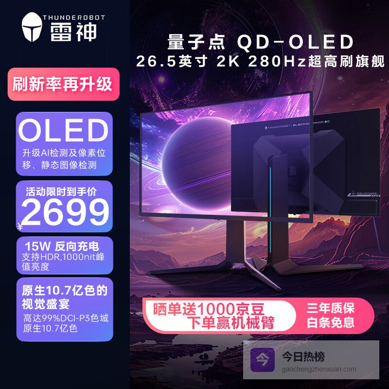 雷神26.5英寸 2K OLED 280Hz硬件低蓝光 0.03ms HDR1000nit Type-C反向充电竞升降旋转显示器DQ27F280E¥