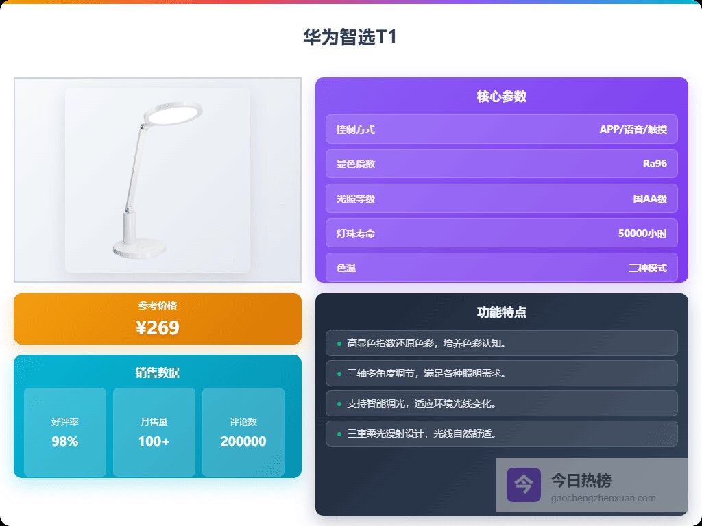 二、华为智选▶ 护眼全光谱:这款台灯采用全光谱灯珠,能有效减少蓝光比例达87.95%,让眼睛不那么容易疲劳。它的光谱曲线接近自然阳光,照明更自然舒适,长时间用眼也不觉得累,特别适合学习和阅读。