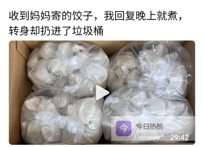 无独有偶,刚才我刷到一个短视频,是一个不回家的成年子女,妈妈给邮寄来满满四大塑料袋的冻饺子,他拍个视频说:收到妈妈寄的饺子,我回复晚上就煮,转身却扔进了垃圾箱。