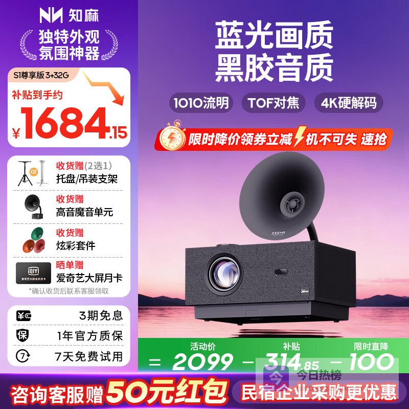 【京东自营】知麻S1尊享版投影仪家用智能便携投影机客厅卧室投影1080P家庭影院TOF自动对焦¥