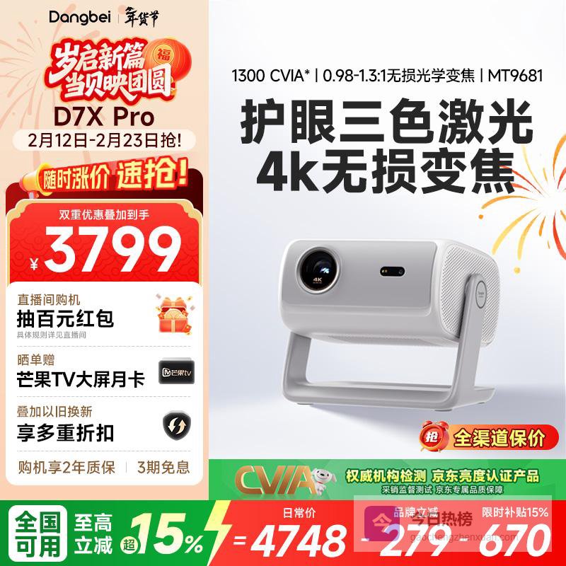 【京东自营】当贝D7XPro4K三色激光投影仪家用超高清家庭影院国家补贴¥