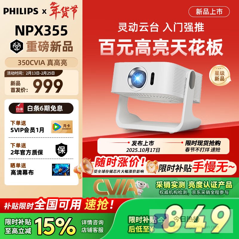 【京东自营】飞利浦NPX355投影仪家用办公客厅家庭影院投影电视高清电脑投屏会议投影机¥