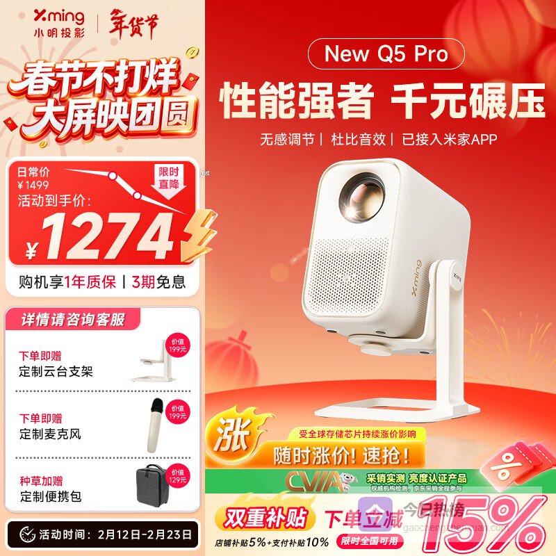 【京东自营】小明NewQ5Pro投影仪家用一体化云台真1080P便携高清家庭影院卧室投影机¥