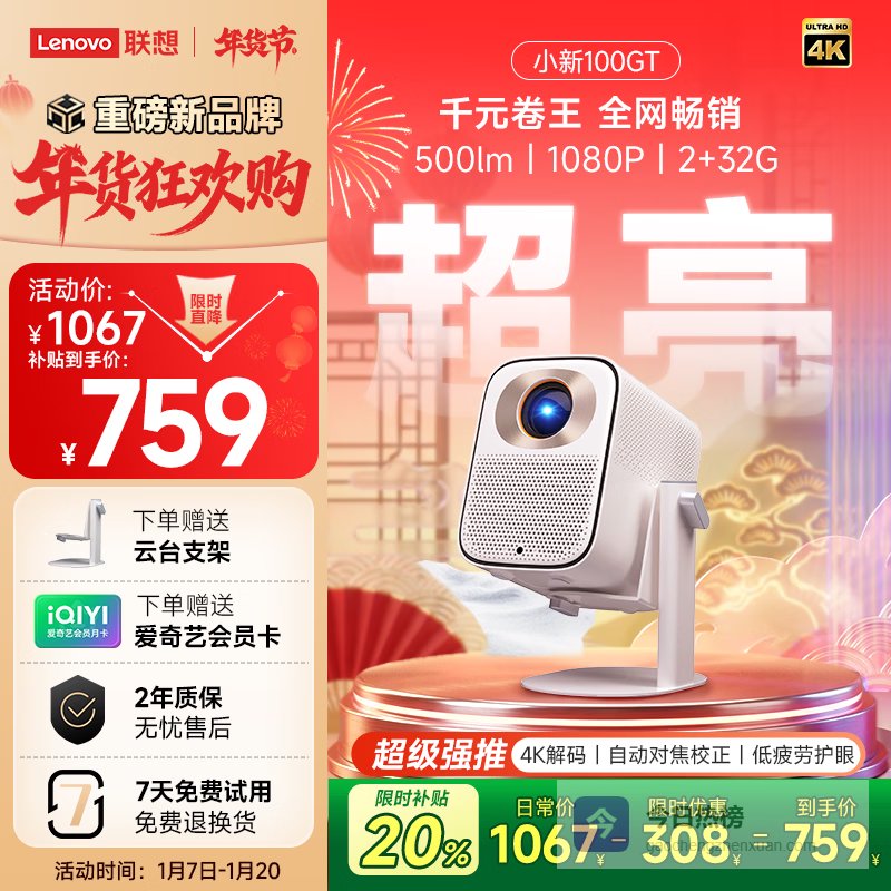 【京东自营】联想小新100GT投影仪2025新款家用卧室真1080P便携投影机智能可白墙直投护眼家庭¥