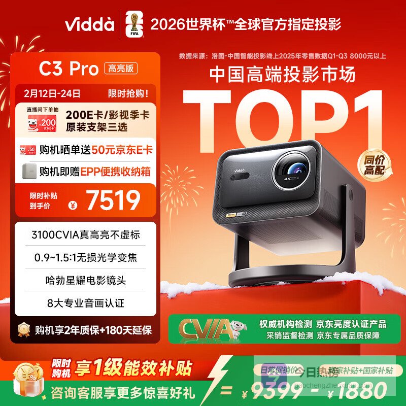 【京东自营】ViddaC3Pro高亮版海信4K超高清三色激光变焦投影仪家用投影机3100CVIA+1¥