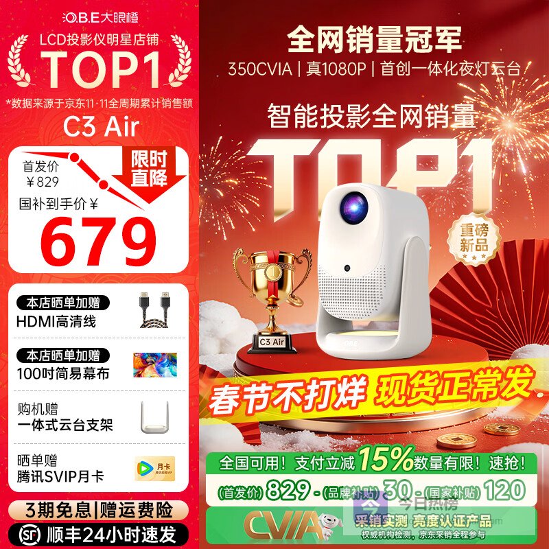 【品牌直营】大眼橙C3Air云台投影仪【购机享9大福利】家用卧室真1080P便携新品投影机智能家庭影¥