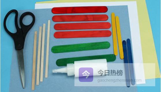 原色窄木条4只负责搭骨架;白胶1瓶是粘合灵魂;剪刀负责裁剪,淡蓝色大张不织布或及纸做天空背景。全部加一起,超市或手工店一趟就能搞定。