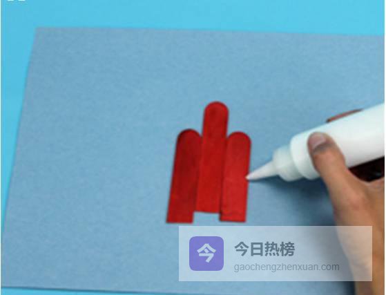 在画纸中央,竖着贴3根红色短木片,像屋顶的瓦片一样层层叠叠。白胶抹匀,手指轻压,屋顶就“站”住了。