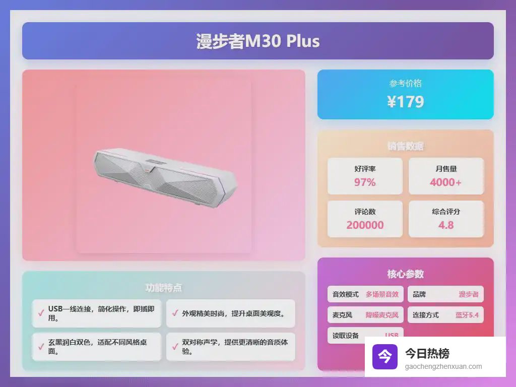 3、漫步者M30 Plus这款漫步者M30 Plus音箱,颜值确实在线,纯白配色和金属网罩设计,科技感满满,摆在桌面上瞬间提升格调。听不少朋友说,它不仅好看,还好听!音质清晰纯净,高音清脆,低音也够劲,细节表现很到位,能让你沉浸在音乐或电影的世界里。自带多种灯效,还能通过APP或PC端自定义,玩出你的专属氛围。