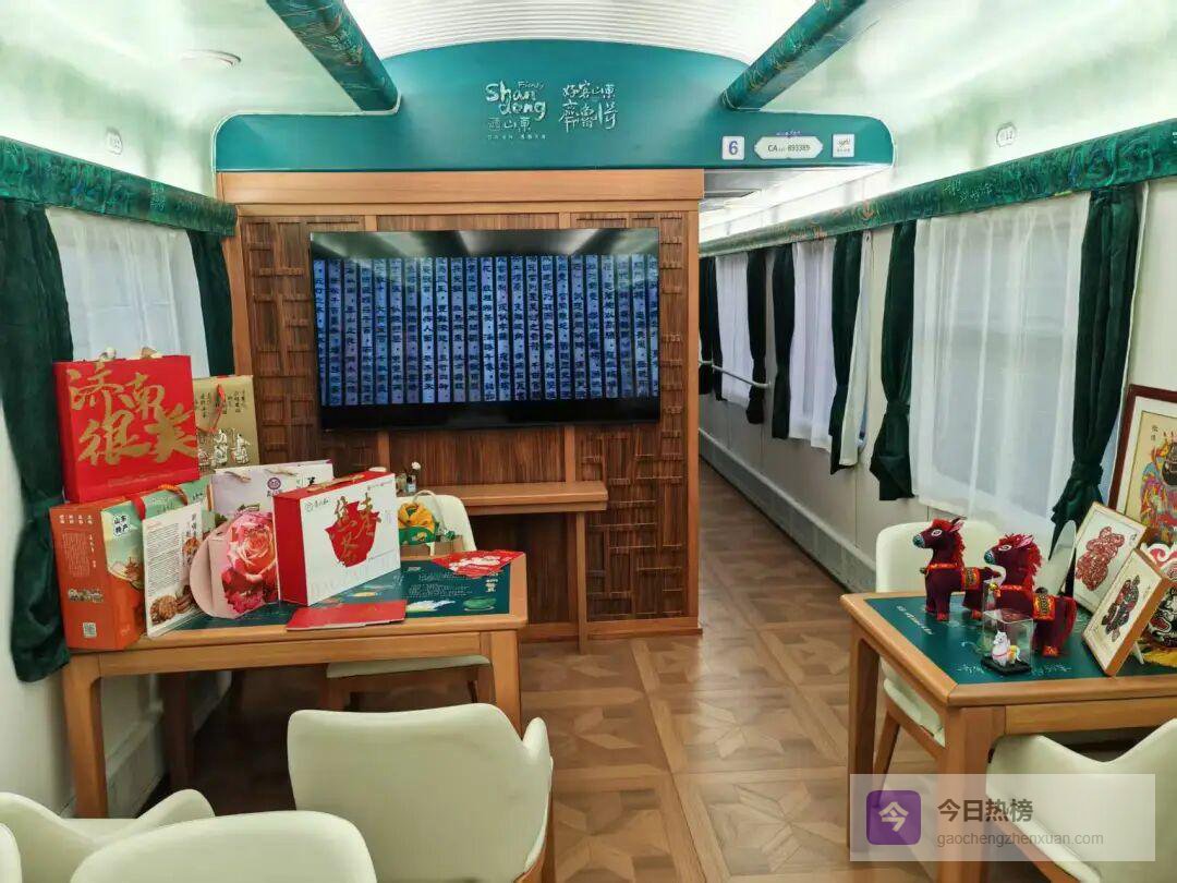 济南作为沿途重要城市,济南市博物馆、章丘区博物馆、济阳区博物馆、长清孝堂山郭氏墓石祠等多件馆藏文物和地面文物元素融入列车,济南市博物馆代表性文物文创在列车展销,让乘客在行进中了解和感受济南深厚的文化底蕴。