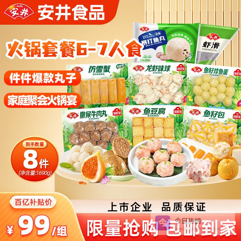 【京东自营】安井火锅食材套餐1690g虾滑牛肉丸鱼丸鱼豆腐蟹柳烧烤丸子源头直C6¥