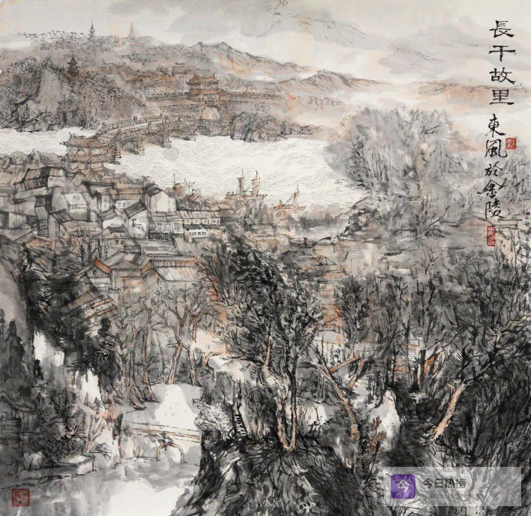 1978年秋,南京艺术学院的一群学生常沿着秦淮河写生。他们把前景留给错落民居,中景推至秦淮河面,背景拉上中华门城堡——画面里的《长干故里》因此自带俯瞰视角:石雕长干桥、精美城门、波涌河水……三十多年过去,老民居被景观化住宅替换,但那条从河里升起的视角线依旧成立——艺术先于记忆一步,替城市守住了旧时的天际线。