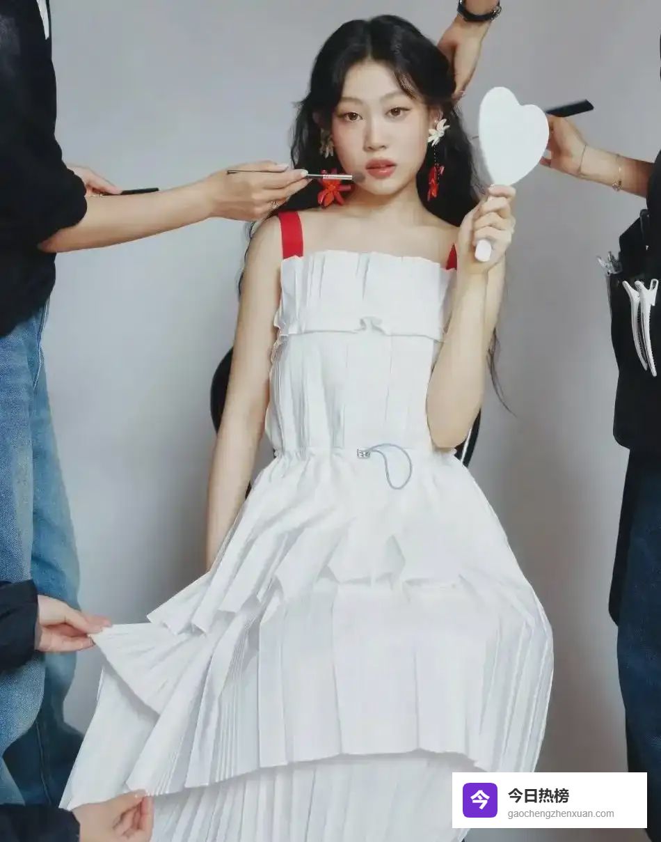 紧接着,12月2日,《精彩OK》杂志放出了她的第二组封面大片。 这次她化身冰雪童话里走出来的韩系公主,头戴白色针织帽,身穿橘粉色Miu Miu吊带裙,或俏皮地站在棕色沙发上,或对着镜头比出“OK”手势,笑容里满是十九岁少女的舒展和自信。