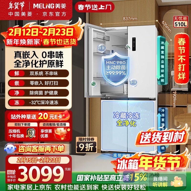 美菱无忧嵌510L十字门冰箱超薄零嵌入四开门双系统底部散热一级能效主动除菌BCD-510WSP9CZX国家补贴¥
