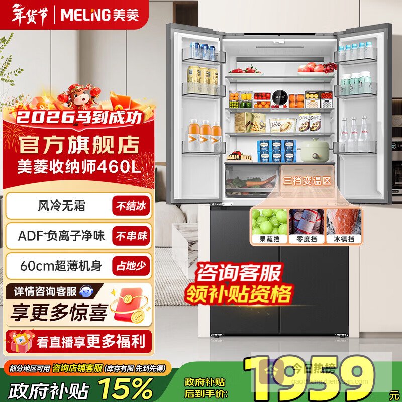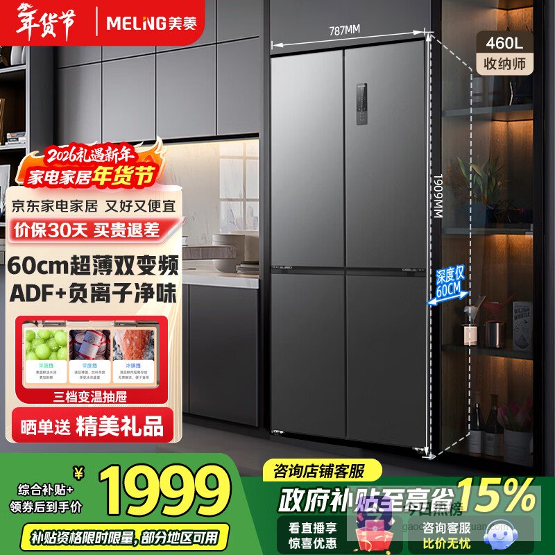 美菱收纳师460十字四门双开门对开门家用大容量60cm超薄节能低噪一级变频风冷无霜电冰箱国家补贴 BCD-460WP9CX-典雅灰¥