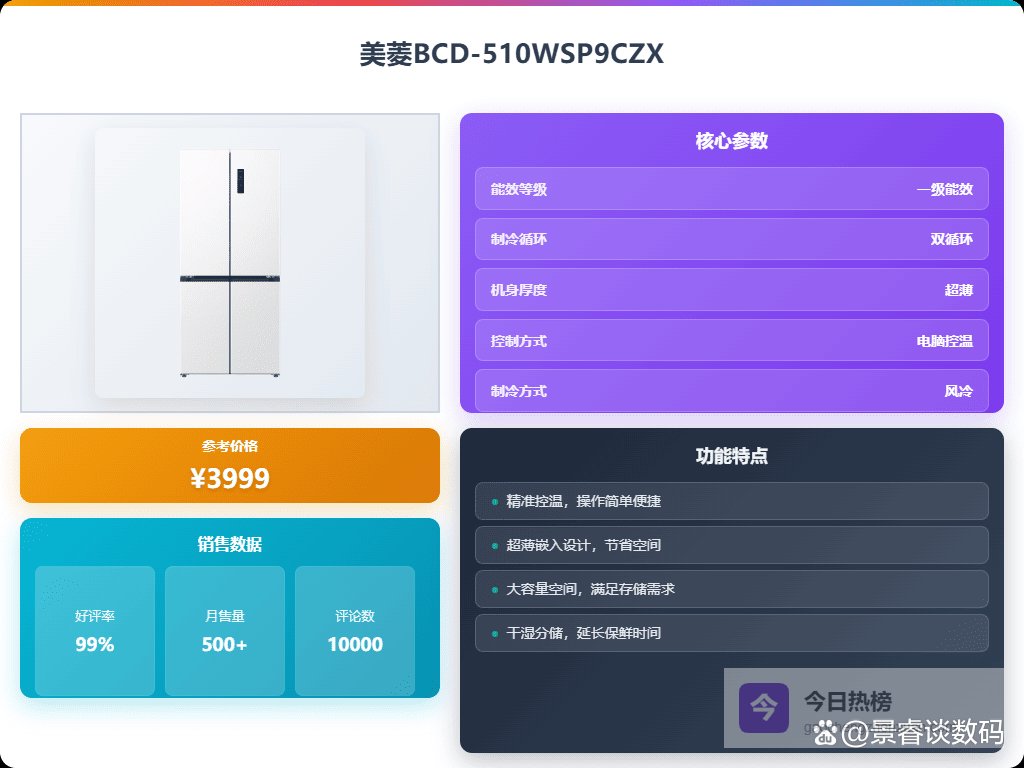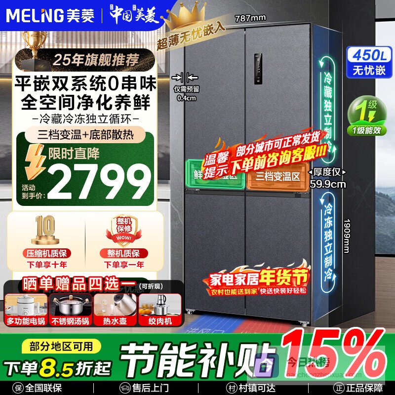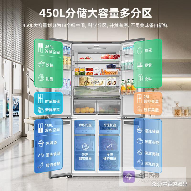 当然啦,如果你们家厨房空间比较小,或者人口不多,那450升左右的超薄款就更合适,比如美菱BCD-460WP9CX或者BCD-450WP9CZX。这种冰箱不仅省空间,还能完美嵌入橱柜,让厨房看起来更整洁美观。别看它体积小,功能可一点都不差,像双蒸发器系统,冷藏冷冻互不干扰,保鲜效果更好。还有就是智能变温区,可以根据不同的食材调节温度,让食材保持最佳状态。总而言之,选冰箱就像选对象,适合自己的才是最好的!