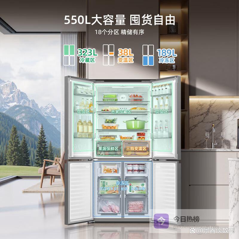这个冰箱容量足够大,550升的储存空间让你再也不用担心食材放不下,家庭囤货、备菜都挺顺手。试了下,里面的空间布局挺合理,分类存放一目了然,食材整齐又有序,不用翻箱倒柜找东西。