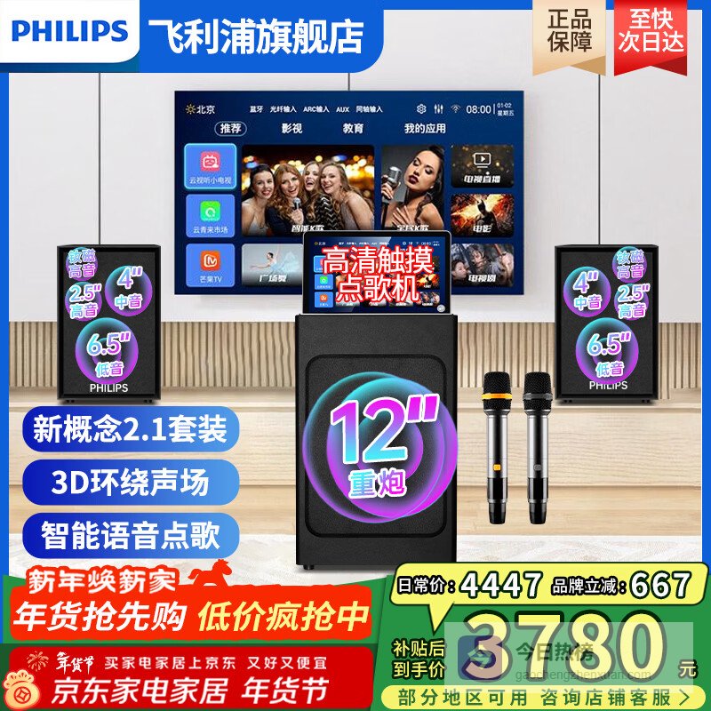 飞利浦音响一体机家庭KTV音响套装2025年新款回音壁K歌家庭唱歌点歌机卡拉OK功放一体机家庭影院蓝牙音箱 【旗舰低音增强款】双低音炮+带触摸屏+内置点歌系统¥